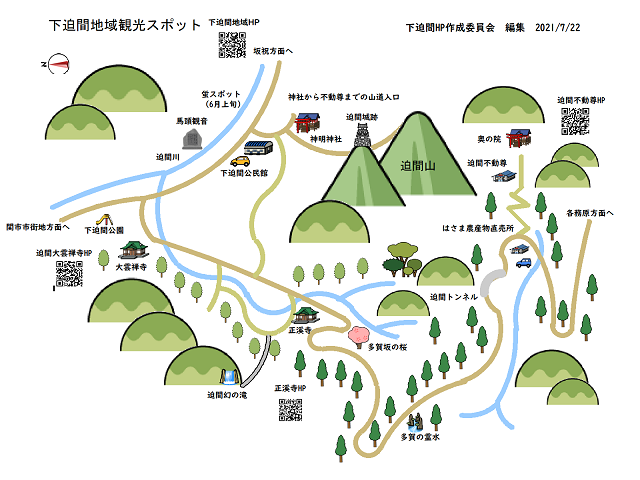 1.観光スポット情報 (1)観光スポット地図 下迫間地域の観光スポットです。魅力的な場所が季節により多くありますので一度お越しください。 (2)観光スポット情報募集 下迫間区の皆さま観光スポットの募集しております。項目、簡単なアピール、写真を募集しております。下迫間HP委員会まで情報をお待ちしております。区民の皆様で多く方に魅力を発信しましょう。 下迫間HP委員会・2021/8/1