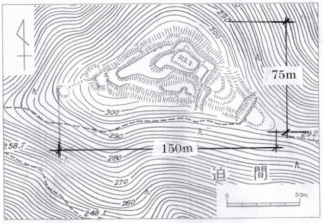 迫間不動尊の北に位置する標高312mにある。東の尾根に2本の掘り切りを入れている。主郭を中心に地形に沿って3段に曲輪を重ねている。明瞭な虎口貴構もなく、比較的古いタイプの城である。迫間山と谷を挟んで相対する南尾根には、「のべぶり岩」と言う岩あり、尾張から美濃へ通信のために旗を振ったという伝承がある。