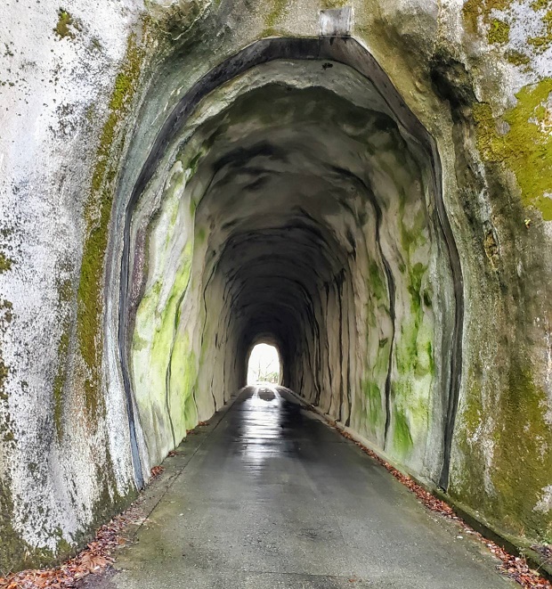 峠のトンネル 昭和30年頃まで迫間不動に行くためには、歩いて山を越さなければなりませんでした。そこで、数人の職人で、ドリルとダイナマイトを使って手作りのトンネルを掘りました。 岩肌が見える細いトンネルの先には、別の世界があるような錯覚を覚えます。 【 写真 】
