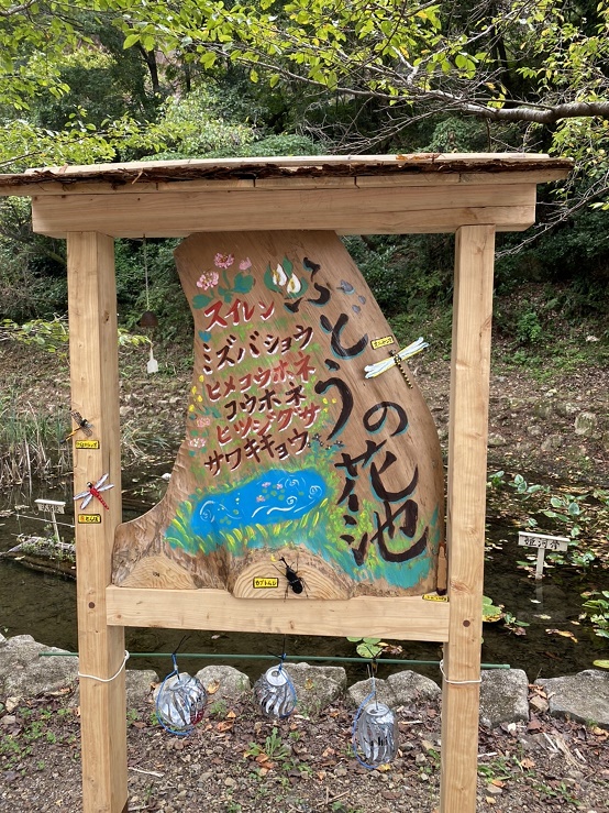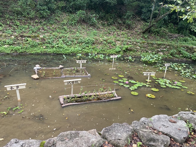 不動尊駐車場の西に花の池があります。睡蓮や水芭蕉等いろいろな花が咲くので、ぜひ、探してみてください。