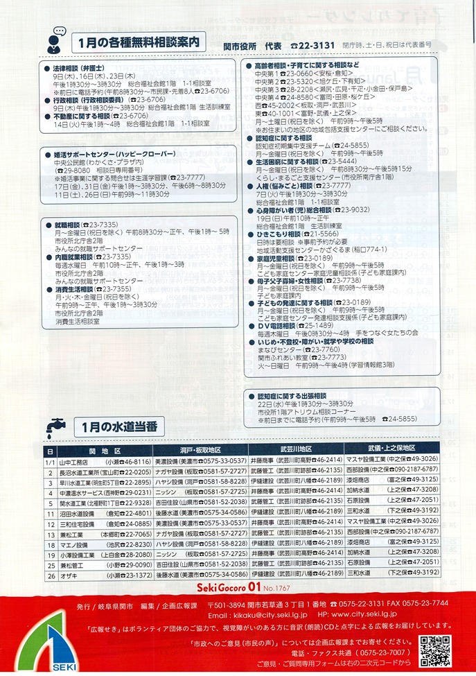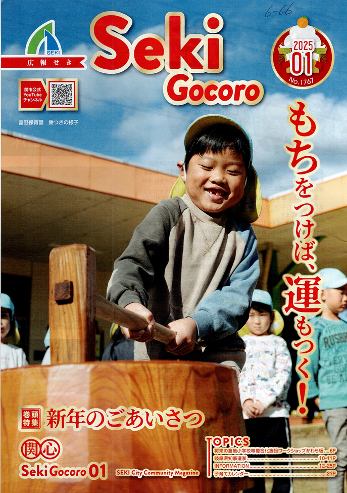 回覧板_広報せき Seki Gocoro_2025_1月号 回覧物を確認ください。・・・ページ数が多いため一部のみ記載 下記のボタンで関市のホームページで回覧できます。 Seki Gocoro 1月号は、https://www.city.seki.lg.jp/0000021615.html 移動ボタン 月が替わればなくなりますので電子書籍版 (Catalog Poket)に過去掲示物は下記にて回覧ください。 1.表紙 ・ ・ ・