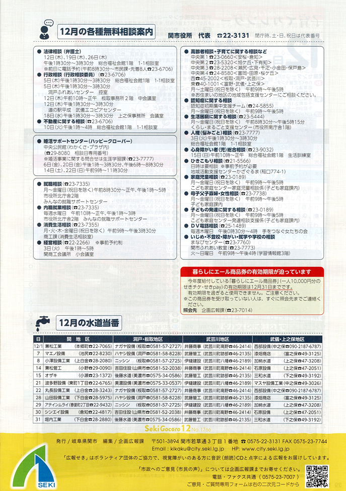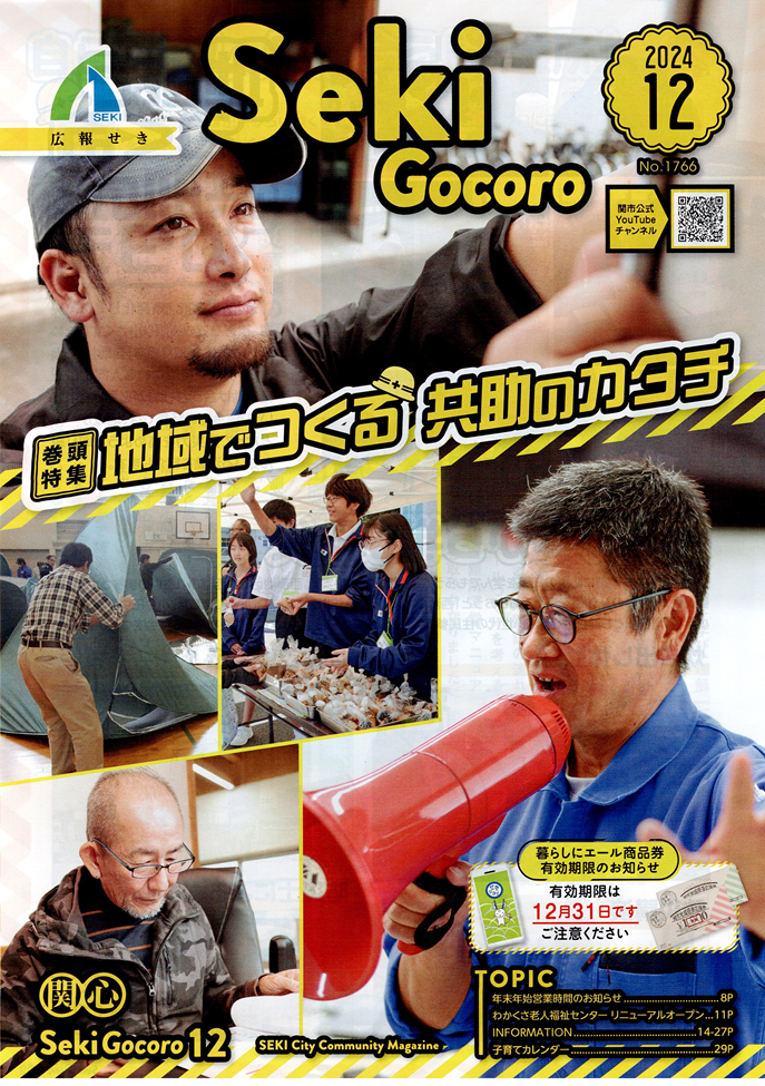 回覧板_広報せき Seki Gocoro_2024_12月号 詳細内容は、回覧配布物を回覧ください。 下記のボタンで関市のホームページで回覧できます。 Seki Gocoro 12月号は、https://www.city.seki.lg.jp/0000021491.html 移動ボタン 月が替わればなくなりますので電子書籍版 (Catalog Poket)に過去掲示物は下記にて回覧ください。 1.表紙 ・ ・ ・