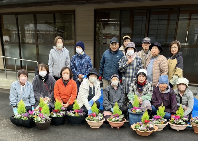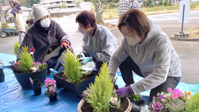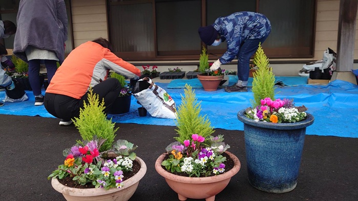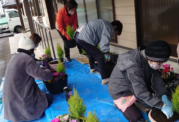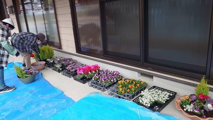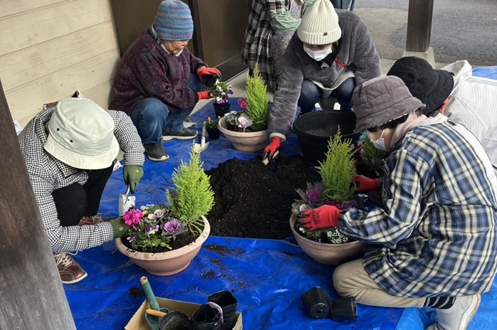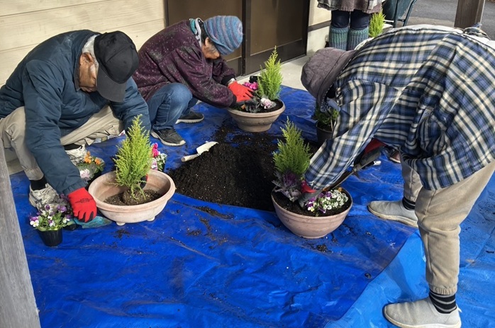 冬空のもと、寄せ植え作りを行いました。