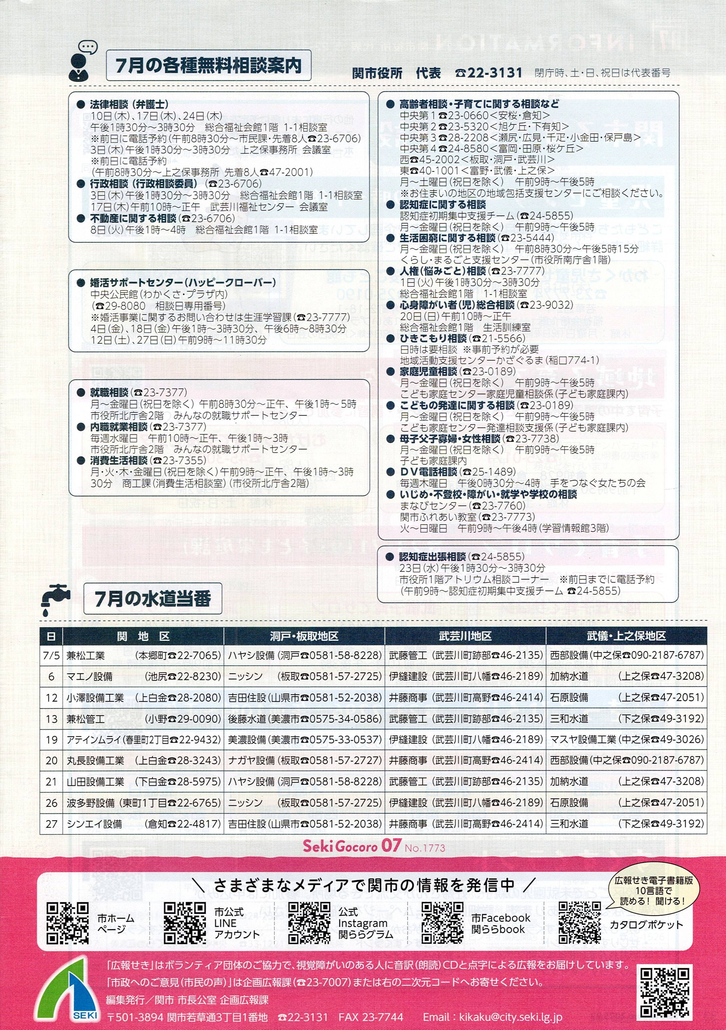 回覧板_広報せき Seki Gocoro_2025_7月号 回覧物を確認ください。・・・ページ数が多いため一部のみ記載 下記のボタンで関市のホームページで回覧できます。 Seki Gocoro 7月号は、https://www.city.seki.lg.jp/0000022192.html ボタン 月が替わればなくなりますので電子書籍版 (Catalog Poket)に過去掲示物は下記にて回覧ください。 1.表紙 ・ ・ 2.裏紙