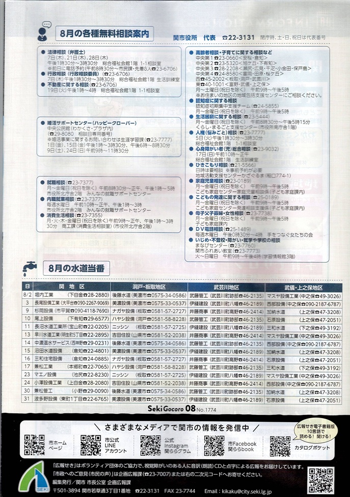 回覧板_広報せき Seki Gocoro_2025_8月号 回覧物を確認ください。・・・ページ数が多いため一部のみ記載 下記のボタンで関市のホームページで回覧できます。 ボタン Seki Gocoro 8月号は、https://www.city.seki.lg.jp/0000022323.html 月が替わればなくなりますので電子書籍版 (Catalog Poket)に過去掲示物は下記にて回覧ください。 1.表紙 ・ ・ 2.裏紙