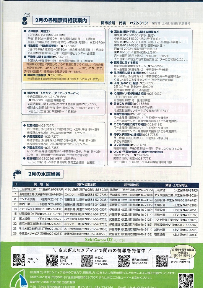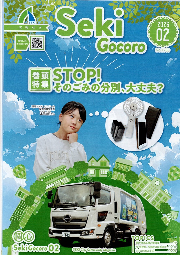 回覧板_広報せき Seki Gocoro_2026_2月号 回覧物を確認ください。・・・ページ数が多いため一部のみ記載 下記のボタンで関市のホームページで回覧できます。 ボタン Seki Gocoro 2月号は、https://www.city.seki.lg.jp/0000022800.html 月が替わればなくなりますので電子書籍版 (Catalog Poket)に過去掲示物は下記にて回覧ください。 1.表紙 ・ ・ 2.裏面