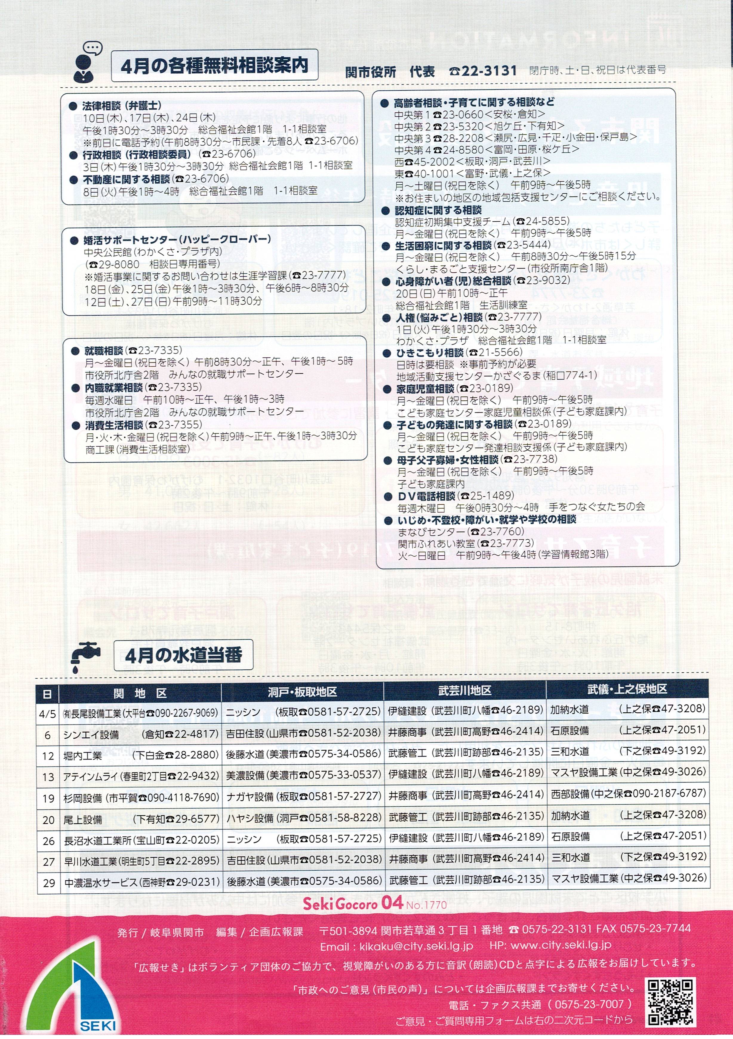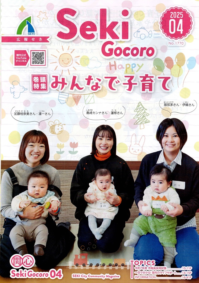 回覧板_広報せき Seki Gocoro_2025_4月号 回覧物を確認ください。・・・ページ数が多いため一部のみ記載 下記のボタンで関市のホームページで回覧できます。 Seki Gocoro4月号は、https://www.city.seki.lg.jp/0000021911.html ボタン 月が替わればなくなりますので電子書籍版 (Catalog Poket)に過去掲示物は下記にて回覧ください。 1.表紙