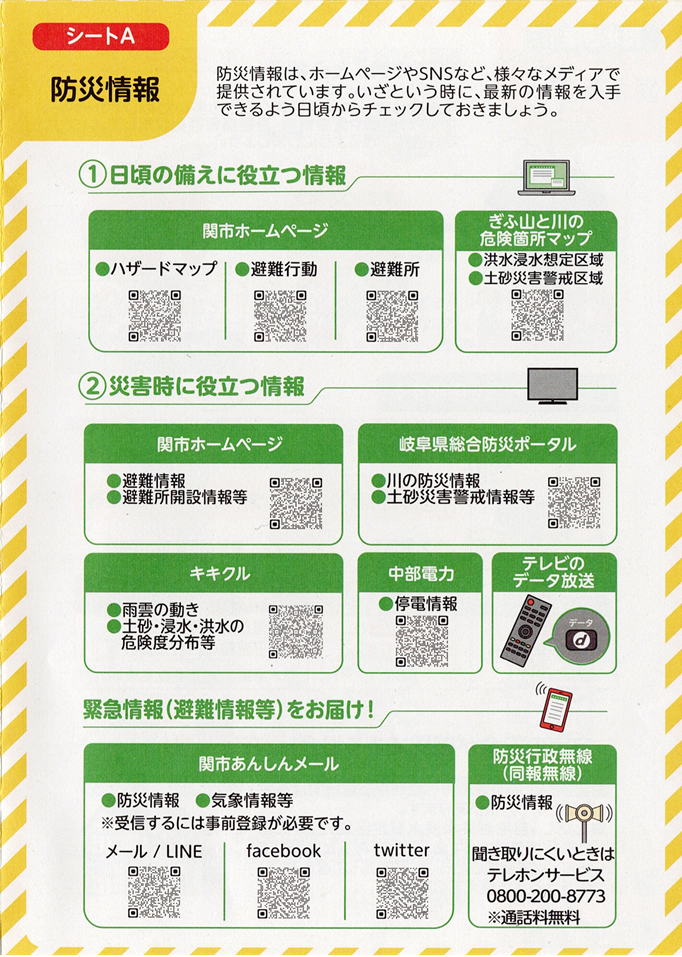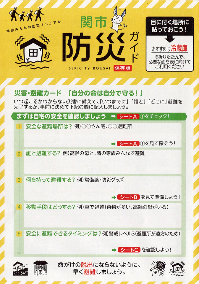 10.関市防災ガイド2024 0.せき防災ポータブル サイト移動ボタン 1.災害・避難カード 2.防災情報 3.非常品持出品&備蓄品 4.避難情報 5.風水被害① 6.風水被害② 7.地震被害① 8.地震被害②