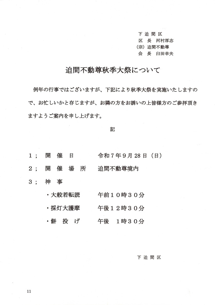 区内活動情報11_迫間不動尊秋季大祭について