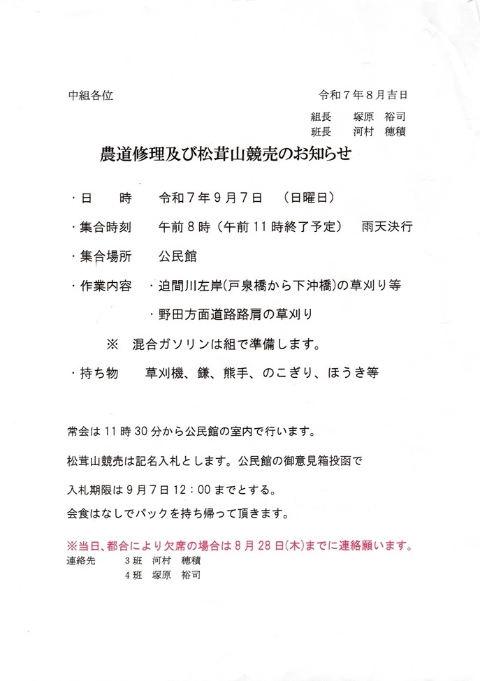 区内活動情報10_農道整備及び松茸山競売のお知らせ